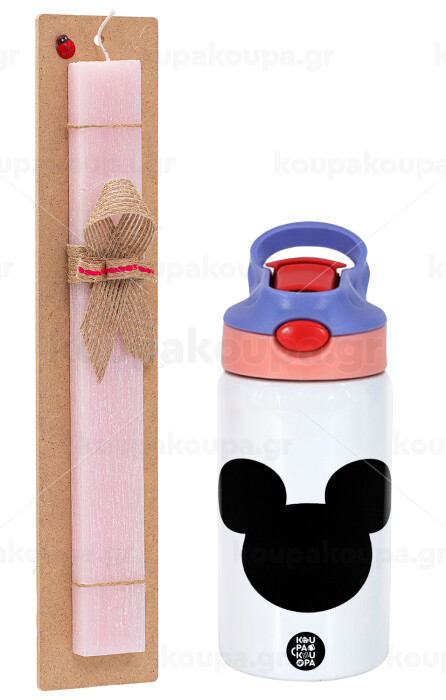 mouse man, Easter Set, Children's thermal stainless steel water bottle with safety straw, pink/purple (350ml) & Easter scented flat candle (30cm) (PINK)