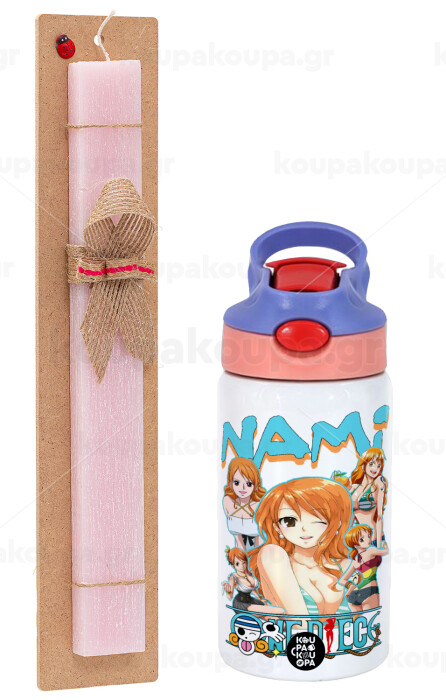 Nami One Piece, Easter Set, Children's thermal stainless steel water bottle with safety straw, pink/purple (350ml) & Easter scented flat candle (30cm) (PINK)
