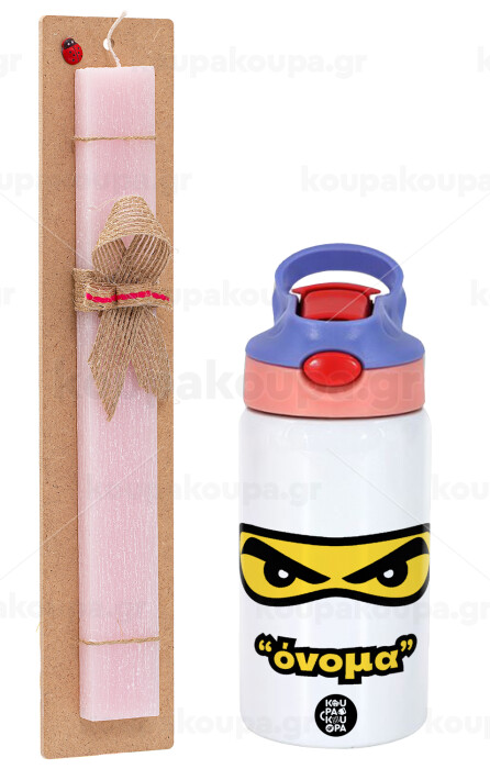 Ninja Eyes με όνομα, Easter Set, Children's thermal stainless steel water bottle with safety straw, pink/purple (350ml) & Easter scented flat candle (30cm) (PINK)