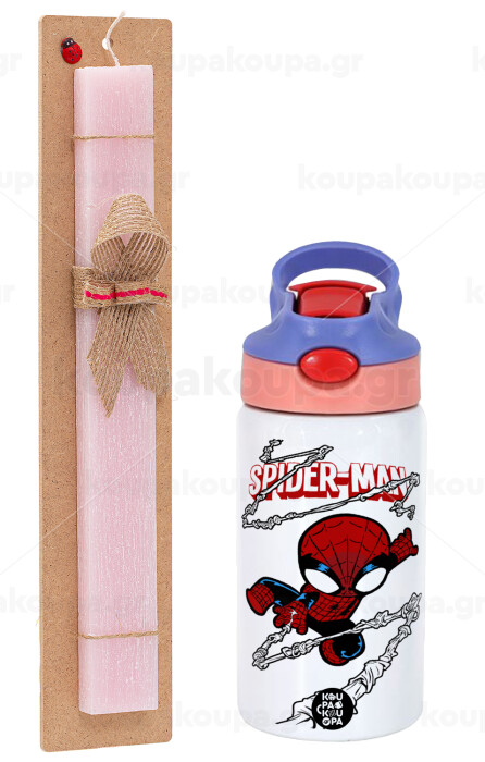 Spiderman kid, Easter Set, Children's thermal stainless steel water bottle with safety straw, pink/purple (350ml) & Easter scented flat candle (30cm) (PINK)