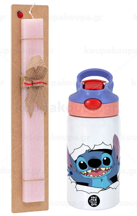 Stitch hello!!!, Easter Set, Children's thermal stainless steel water bottle with safety straw, pink/purple (350ml) & Easter scented flat candle (30cm) (PINK)