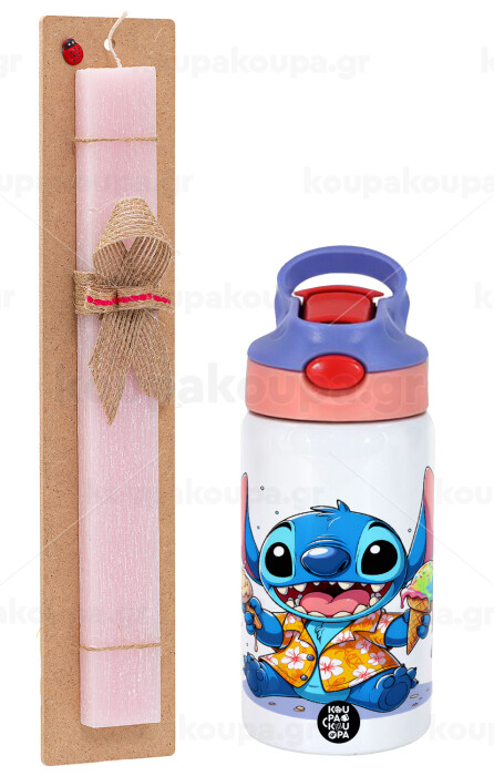 Stitch Ice cream, Easter Set, Children's thermal stainless steel water bottle with safety straw, pink/purple (350ml) & Easter scented flat candle (30cm) (PINK)