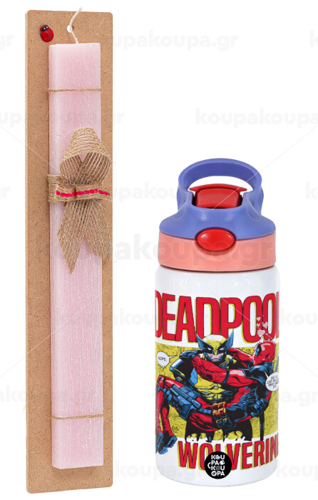 Superhero Deadpool Wolverine, Easter Set, Children's thermal stainless steel water bottle with safety straw, pink/purple (350ml) & Easter scented flat candle (30cm) (PINK)