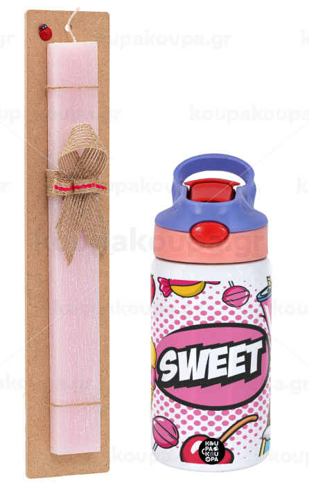 SWEET, Easter Set, Children's thermal stainless steel water bottle with safety straw, pink/purple (350ml) & Easter scented flat candle (30cm) (PINK)