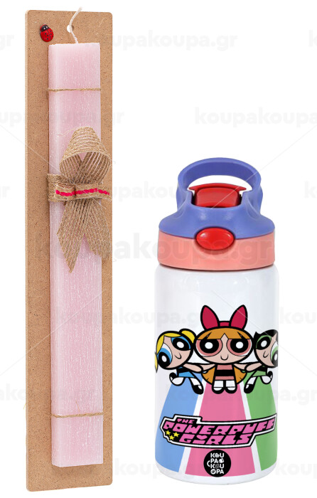 The powerpuff girls , Easter Set, Children's thermal stainless steel water bottle with safety straw, pink/purple (350ml) & Easter scented flat candle (30cm) (PINK)