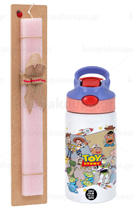 toystory characters, Easter Set, Children's thermal stainless steel water bottle with safety straw, pink/purple (350ml) & Easter scented flat candle (30cm) (PINK)