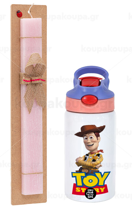 Woody cowboy, Easter Set, Children's thermal stainless steel water bottle with safety straw, pink/purple (350ml) & Easter scented flat candle (30cm) (PINK)