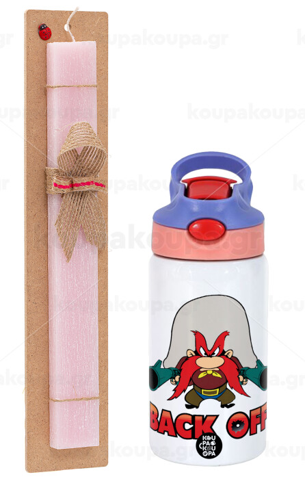 Yosemite Sam Back OFF, Easter Set, Children's thermal stainless steel water bottle with safety straw, pink/purple (350ml) & Easter scented flat candle (30cm) (PINK)