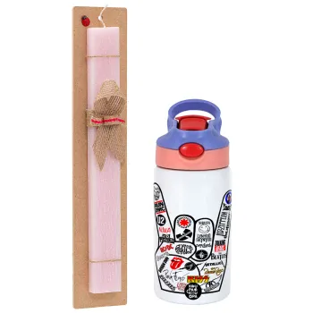Best Rock Bands hand, Easter Set, Children's thermal stainless steel water bottle with safety straw, pink/purple (350ml) & Easter scented flat candle (30cm) (PINK)