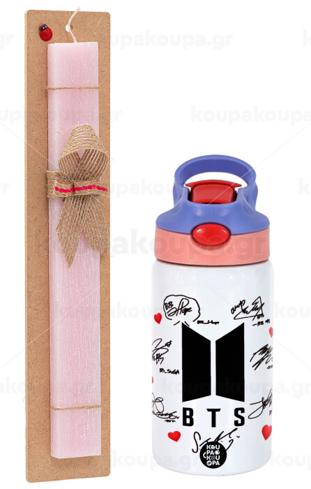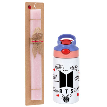 BTS signs, Easter Set, Children's thermal stainless steel water bottle with safety straw, pink/purple (350ml) & Easter scented flat candle (30cm) (PINK)