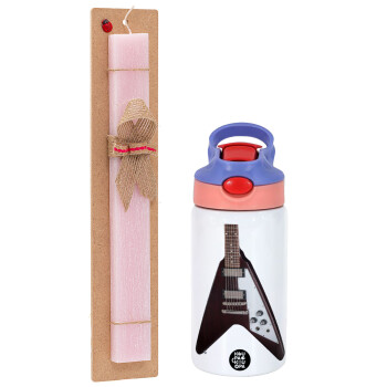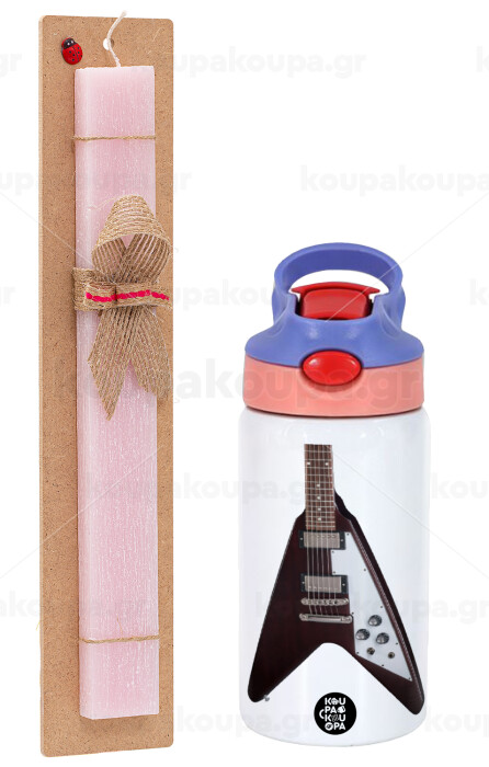 Guitar flying V, Easter Set, Children's thermal stainless steel water bottle with safety straw, pink/purple (350ml) & Easter scented flat candle (30cm) (PINK)