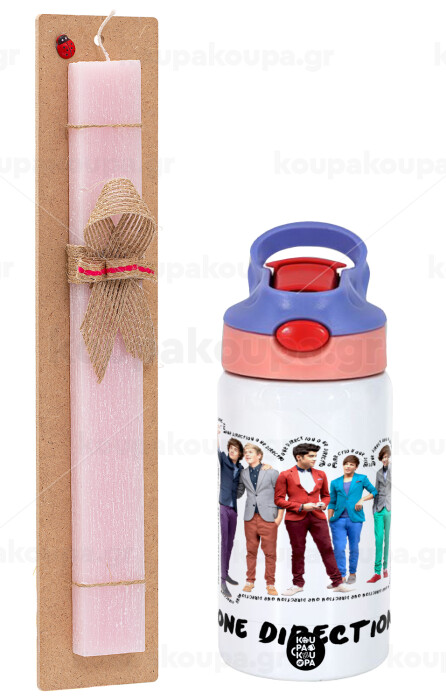 One Direction , Easter Set, Children's thermal stainless steel water bottle with safety straw, pink/purple (350ml) & Easter scented flat candle (30cm) (PINK)