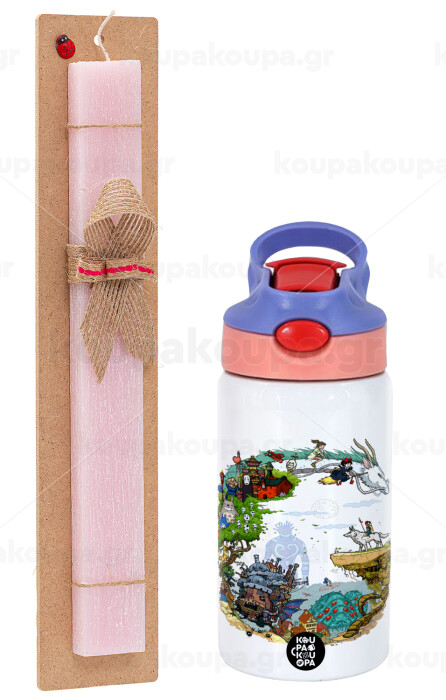 Στούδιο Γκίβλι, Easter Set, Children's thermal stainless steel water bottle with safety straw, pink/purple (350ml) & Easter scented flat candle (30cm) (PINK)