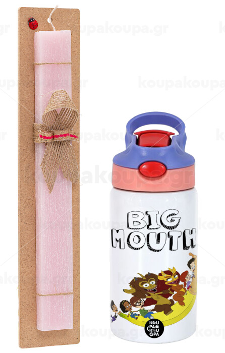 Big mouth, Easter Set, Children's thermal stainless steel water bottle with safety straw, pink/purple (350ml) & Easter scented flat candle (30cm) (PINK)