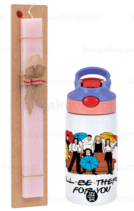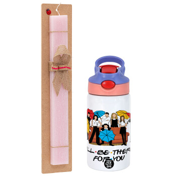 Friends cover, Easter Set, Children's thermal stainless steel water bottle with safety straw, pink/purple (350ml) & Easter scented flat candle (30cm) (PINK)
