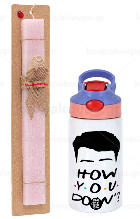 Friends how you doin?, Easter Set, Children's thermal stainless steel water bottle with safety straw, pink/purple (350ml) & Easter scented flat candle (30cm) (PINK)