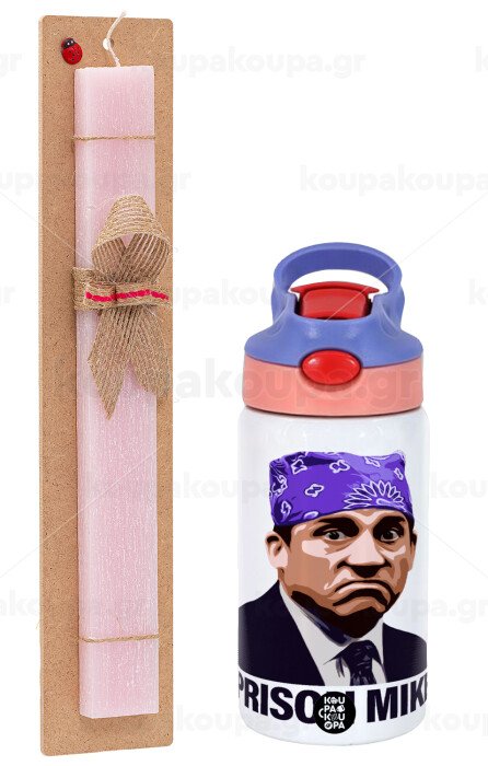 Prison Mike The office, Easter Set, Children's thermal stainless steel water bottle with safety straw, pink/purple (350ml) & Easter scented flat candle (30cm) (PINK)