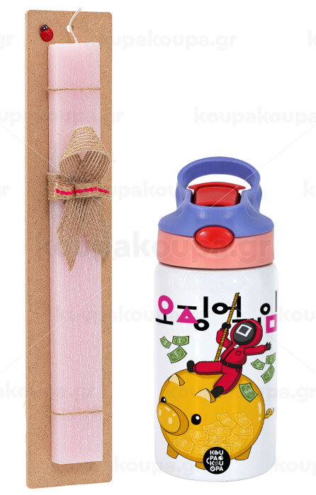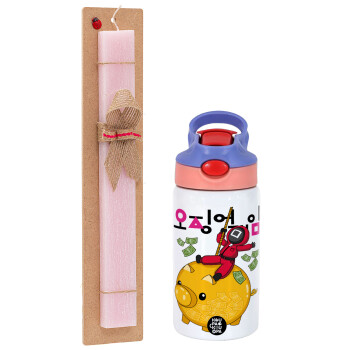 Squid game money pig, Easter Set, Children's thermal stainless steel water bottle with safety straw, pink/purple (350ml) & Easter scented flat candle (30cm) (PINK)
