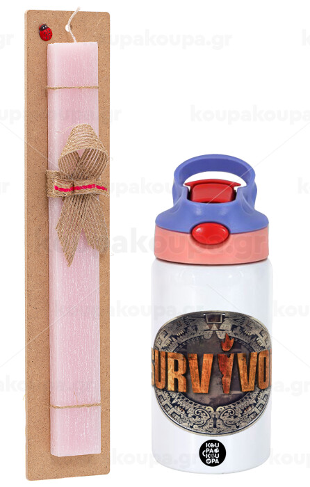 Survivor, Easter Set, Children's thermal stainless steel water bottle with safety straw, pink/purple (350ml) & Easter scented flat candle (30cm) (PINK)