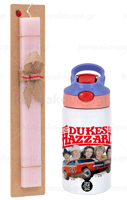 The Dukes of Hazzard, Easter Set, Children's thermal stainless steel water bottle with safety straw, pink/purple (350ml) & Easter scented flat candle (30cm) (PINK)