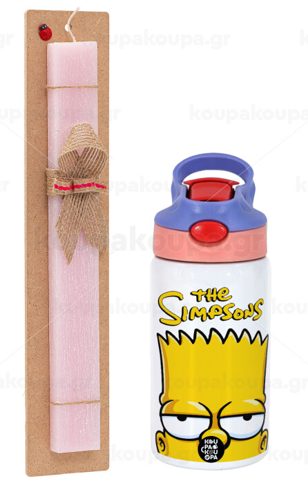 The Simpsons Bart, Easter Set, Children's thermal stainless steel water bottle with safety straw, pink/purple (350ml) & Easter scented flat candle (30cm) (PINK)