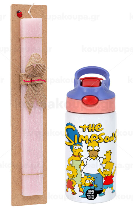 The Simpsons, Easter Set, Children's thermal stainless steel water bottle with safety straw, pink/purple (350ml) & Easter scented flat candle (30cm) (PINK)