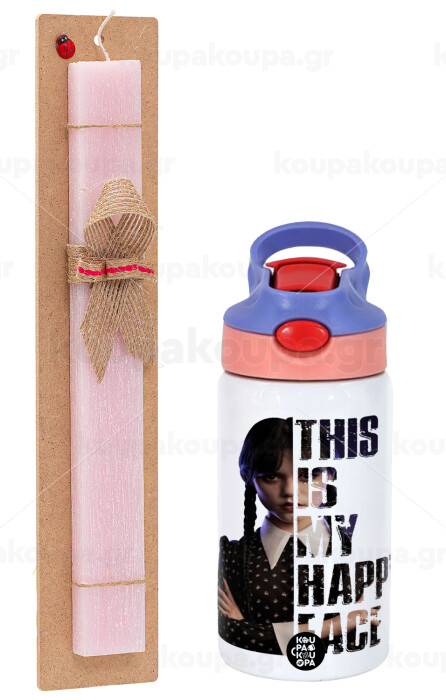 Wednesday, This is my happy face, Easter Set, Children's thermal stainless steel water bottle with safety straw, pink/purple (350ml) & Easter scented flat candle (30cm) (PINK)