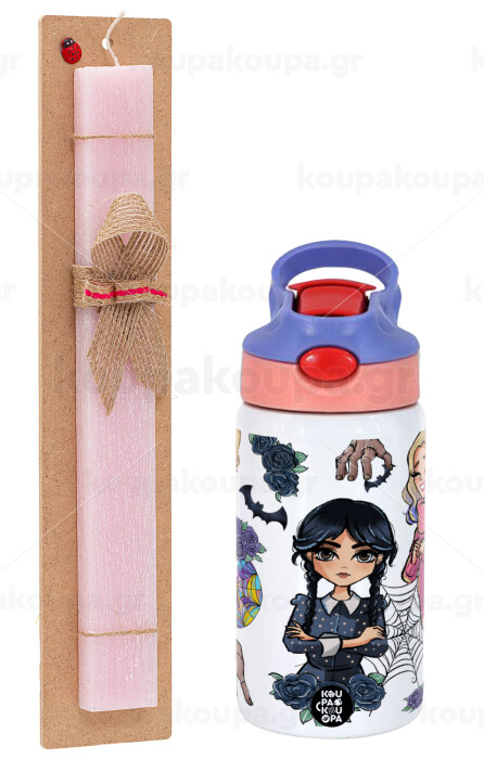 Wednesday and Enid Sinclair, Easter Set, Children's thermal stainless steel water bottle with safety straw, pink/purple (350ml) & Easter scented flat candle (30cm) (PINK)
