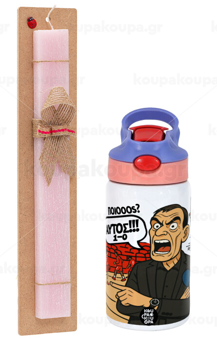 Μπαρτζό, Ποιος? Αυτός!!! 1-0, Easter Set, Children's thermal stainless steel water bottle with safety straw, pink/purple (350ml) & Easter scented flat candle (30cm) (PINK)