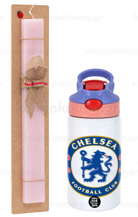 FC Chelsea, Easter Set, Children's thermal stainless steel water bottle with safety straw, pink/purple (350ml) & Easter scented flat candle (30cm) (PINK)