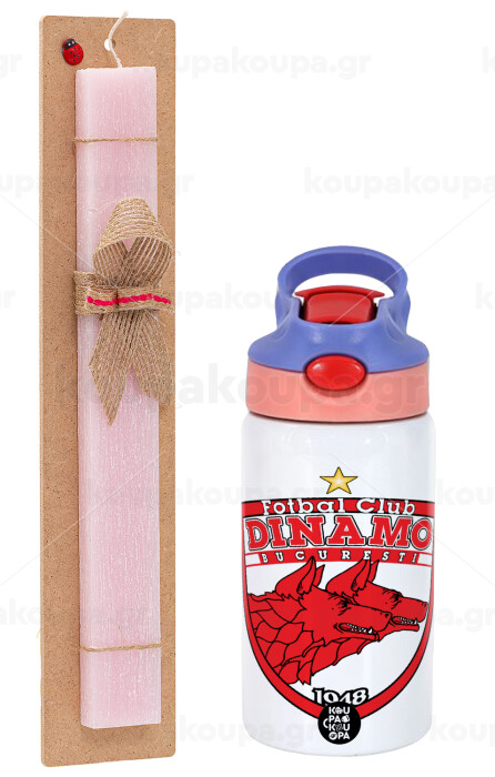 FC Dinamo Bucuresti, Easter Set, Children's thermal stainless steel water bottle with safety straw, pink/purple (350ml) & Easter scented flat candle (30cm) (PINK)