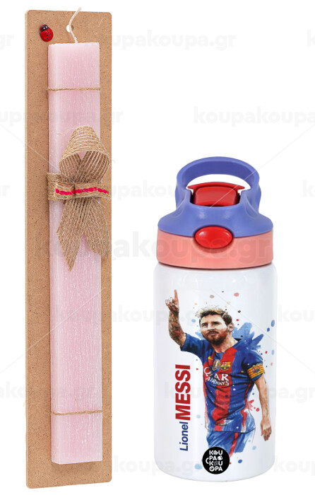 Lionel Messi, Easter Set, Children's thermal stainless steel water bottle with safety straw, pink/purple (350ml) & Easter scented flat candle (30cm) (PINK)