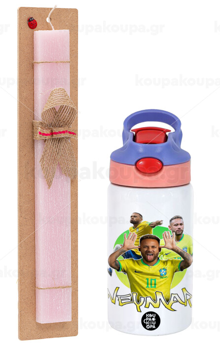 Neymar JR, Easter Set, Children's thermal stainless steel water bottle with safety straw, pink/purple (350ml) & Easter scented flat candle (30cm) (PINK)