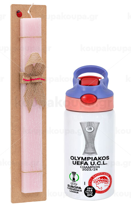 Olympiacos UEFA Europa Conference League Champion 2023/24, Easter Set, Children's thermal stainless steel water bottle with safety straw, pink/purple (350ml) & Easter scented flat candle (30cm) (PINK)