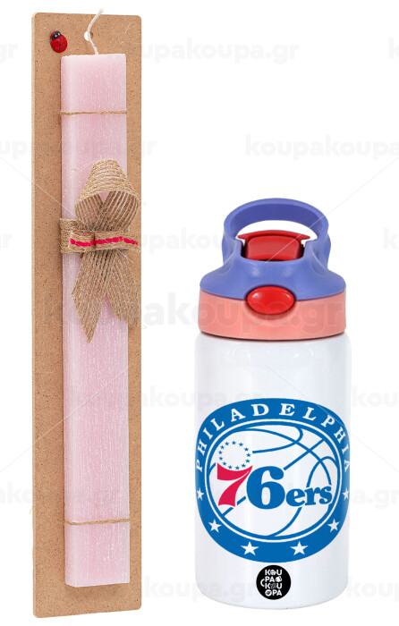 Philadelphia 76ers, Easter Set, Children's thermal stainless steel water bottle with safety straw, pink/purple (350ml) & Easter scented flat candle (30cm) (PINK)