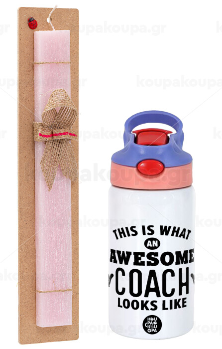This is what an awesome COACH looks like!, Easter Set, Children's thermal stainless steel water bottle with safety straw, pink/purple (350ml) & Easter scented flat candle (30cm) (PINK)