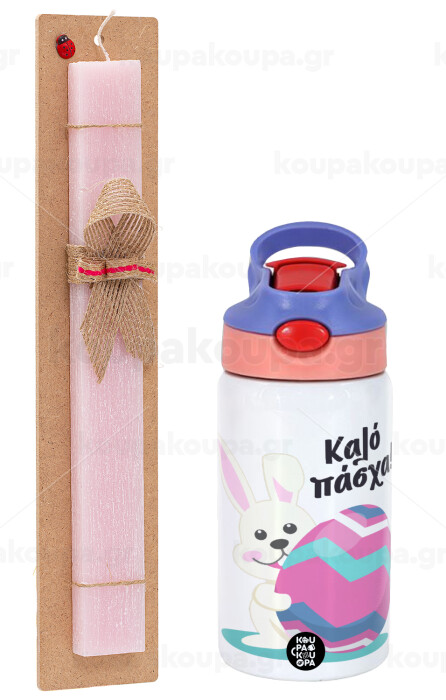 Καλό πάσχα, Easter Set, Children's thermal stainless steel water bottle with safety straw, pink/purple (350ml) & Easter scented flat candle (30cm) (PINK)