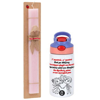 Σ΄ αγαπώ σ΄ αγαπώ που με βάζεις, Easter Set, Children's thermal stainless steel water bottle with safety straw, pink/purple (350ml) & Easter scented flat candle (30cm) (PINK)