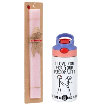 I Love you for your personality, Easter Set, Children's thermal stainless steel water bottle with safety straw, pink/purple (350ml) & Easter scented flat candle (30cm) (PINK)