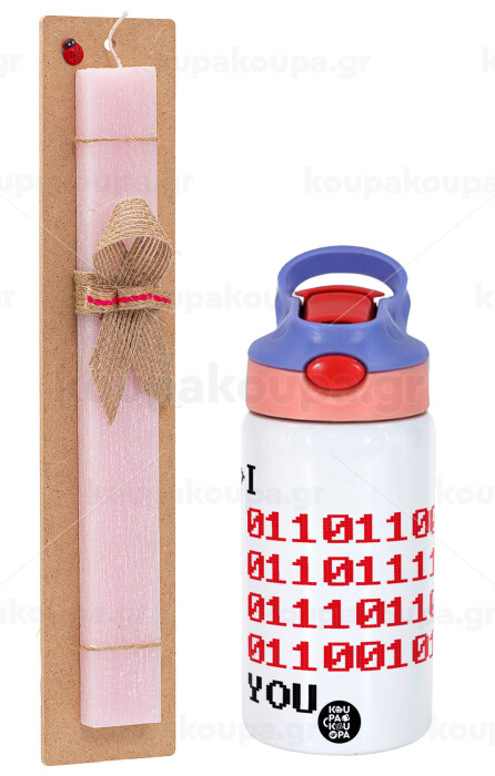 I .... YOU, binary secret MSG, Easter Set, Children's thermal stainless steel water bottle with safety straw, pink/purple (350ml) & Easter scented flat candle (30cm) (PINK)