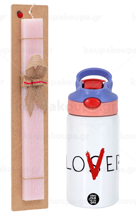 IT Lov(s)er, Easter Set, Children's thermal stainless steel water bottle with safety straw, pink/purple (350ml) & Easter scented flat candle (30cm) (PINK)