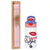 Mrs always right kiss, Easter Set, Children's thermal stainless steel water bottle with safety straw, pink/purple (350ml) & Easter scented flat candle (30cm) (PINK)