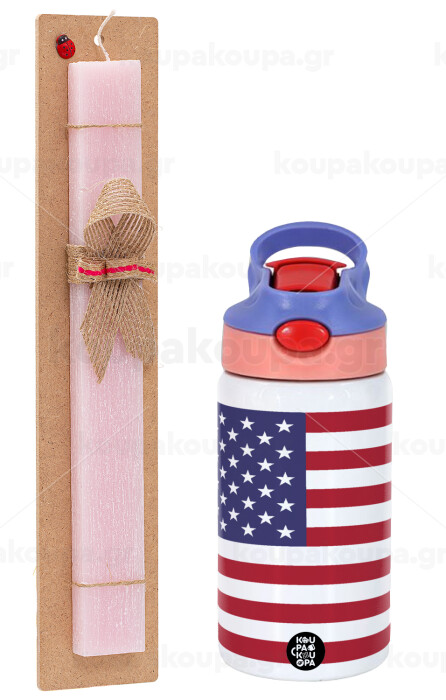 USA Flag, Easter Set, Children's thermal stainless steel water bottle with safety straw, pink/purple (350ml) & Easter scented flat candle (30cm) (PINK)