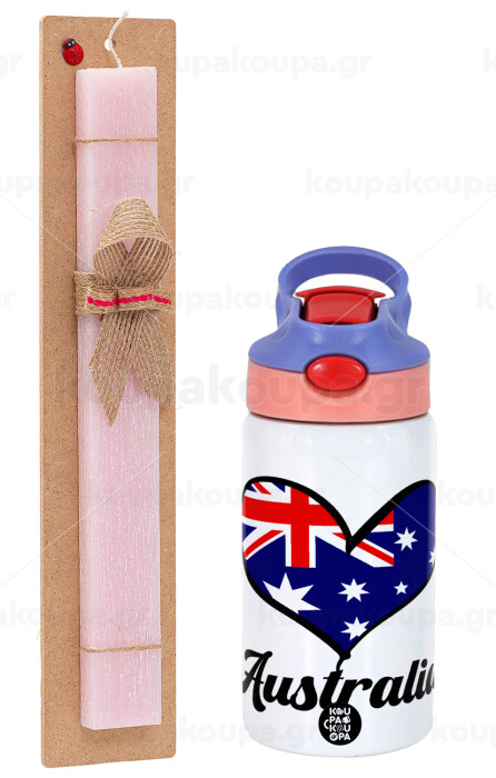 Australia flag, Easter Set, Children's thermal stainless steel water bottle with safety straw, pink/purple (350ml) & Easter scented flat candle (30cm) (PINK)