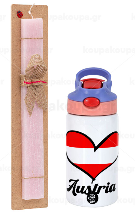 Austria flag, Easter Set, Children's thermal stainless steel water bottle with safety straw, pink/purple (350ml) & Easter scented flat candle (30cm) (PINK)
