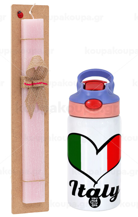 Italy flag, Easter Set, Children's thermal stainless steel water bottle with safety straw, pink/purple (350ml) & Easter scented flat candle (30cm) (PINK)