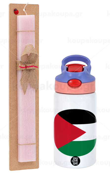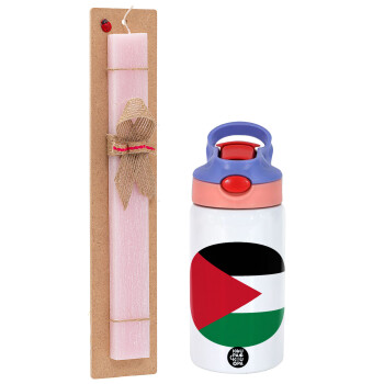 Palestine Flag, Easter Set, Children's thermal stainless steel water bottle with safety straw, pink/purple (350ml) & Easter scented flat candle (30cm) (PINK)