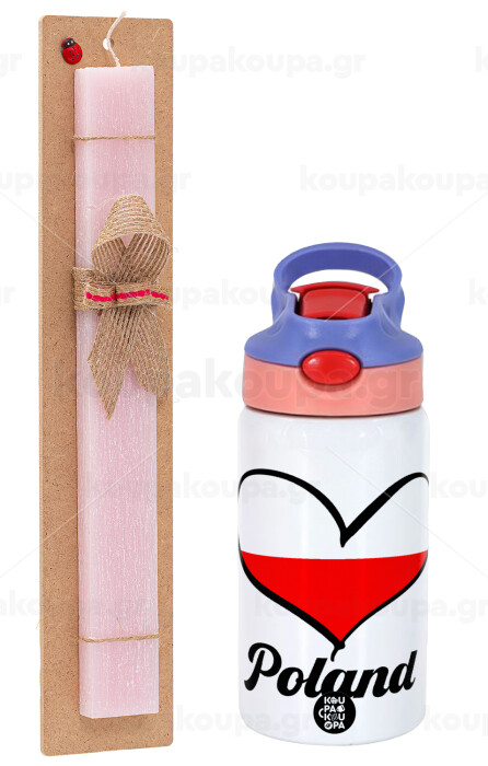 Poland flag, Easter Set, Children's thermal stainless steel water bottle with safety straw, pink/purple (350ml) & Easter scented flat candle (30cm) (PINK)