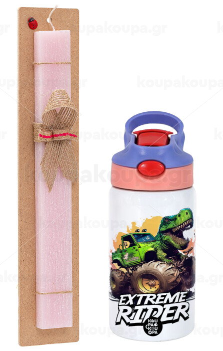 Extreme rider Dyno, Easter Set, Children's thermal stainless steel water bottle with safety straw, pink/purple (350ml) & Easter scented flat candle (30cm) (PINK)