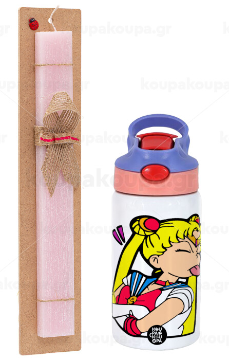 Sailor Moon, Easter Set, Children's thermal stainless steel water bottle with safety straw, pink/purple (350ml) & Easter scented flat candle (30cm) (PINK)